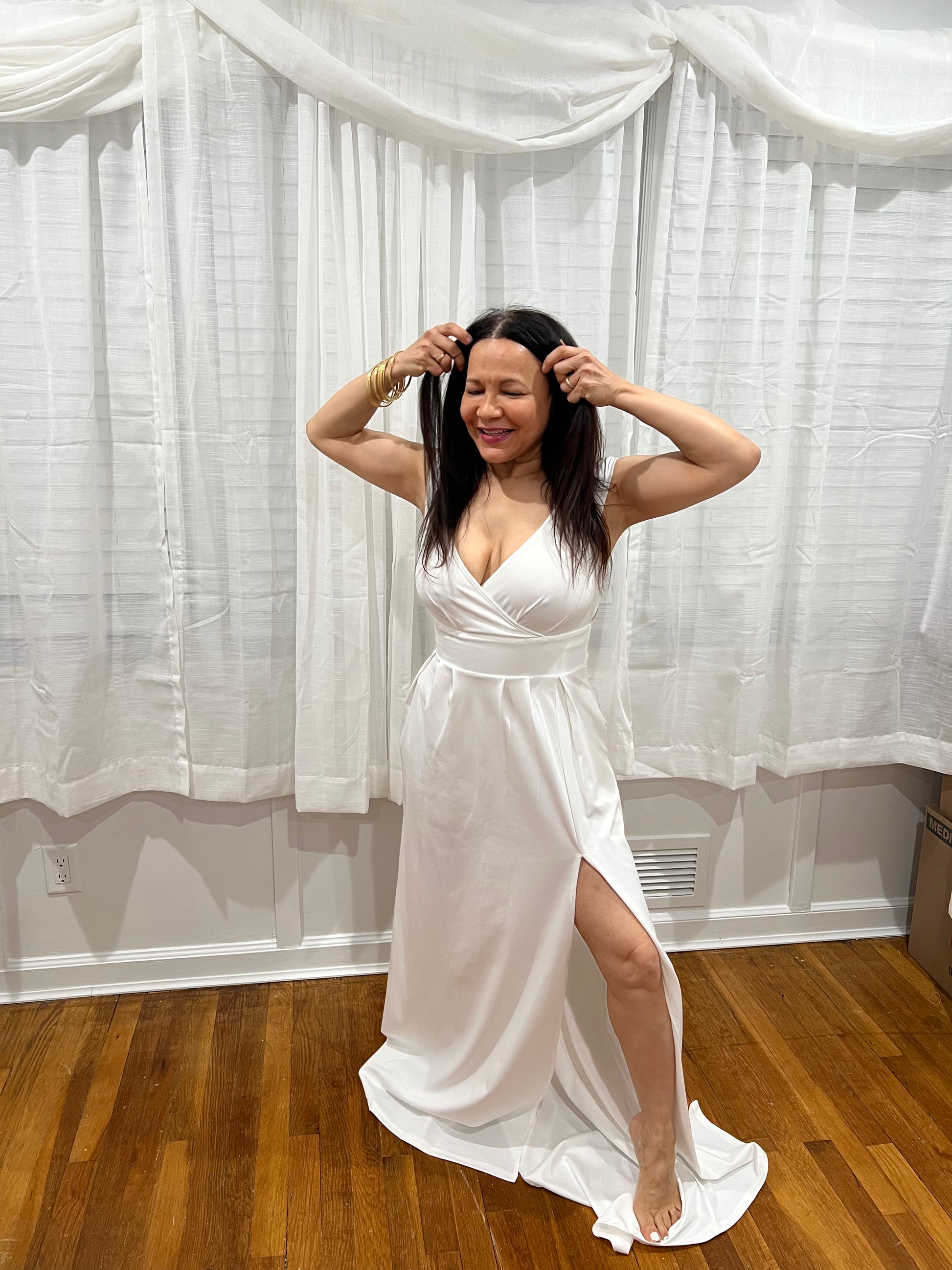 WHITE AND ELEGANT LONG DRESS, NON-SLEEVE SOPHISTICATE LOOK FOR ANY OCCASIONS INCLUDING GETTING MARRIED. ITS A LOOK THAT ANY WOMAN DREAMS ABOUT IT.