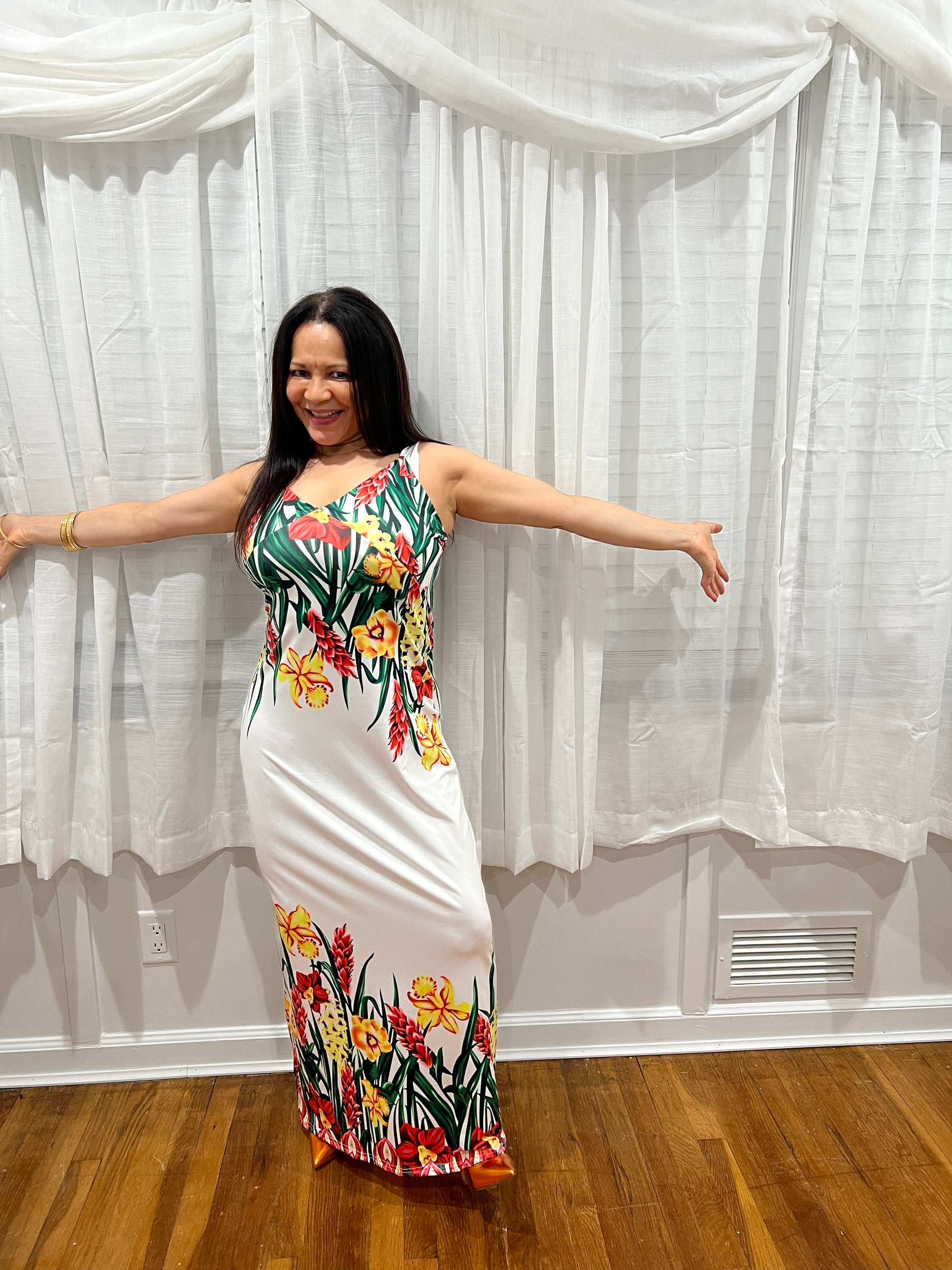 LONG DRESS WITH ORIENTAL FLOWERS SPRING,SUMMER. ANY TIME LONG DRESS ORIENTAL FLOWERS WHITE BASE AND BEAUTIFUL ORIENTAL FLOWERS, NON SLEEVES FRONT STYLE. LIGHT GREAT FOR VACATIONS.
