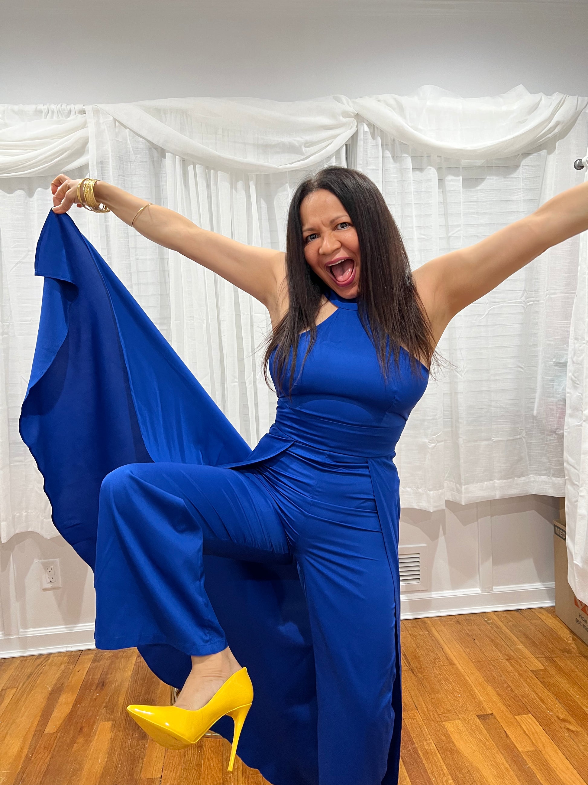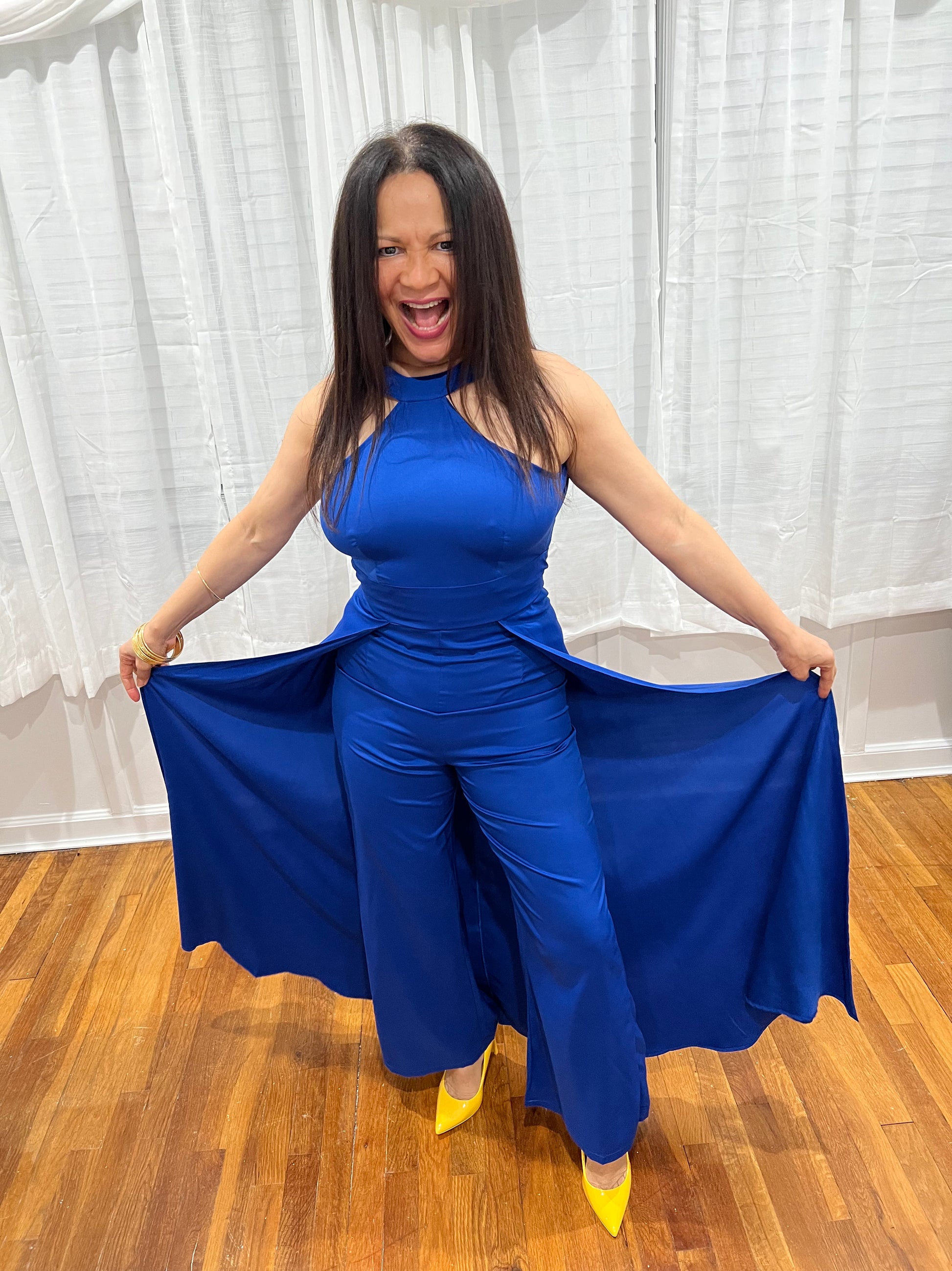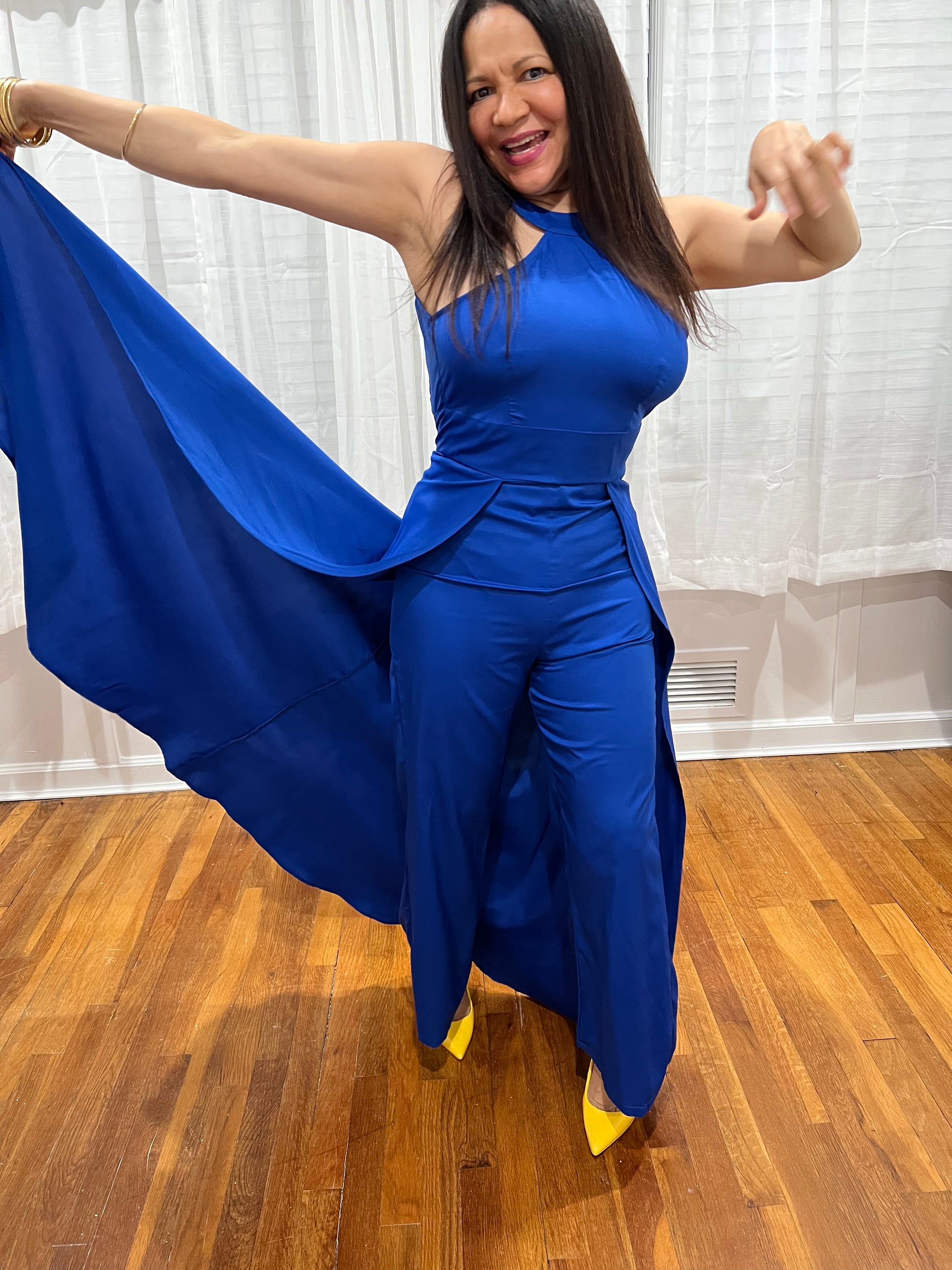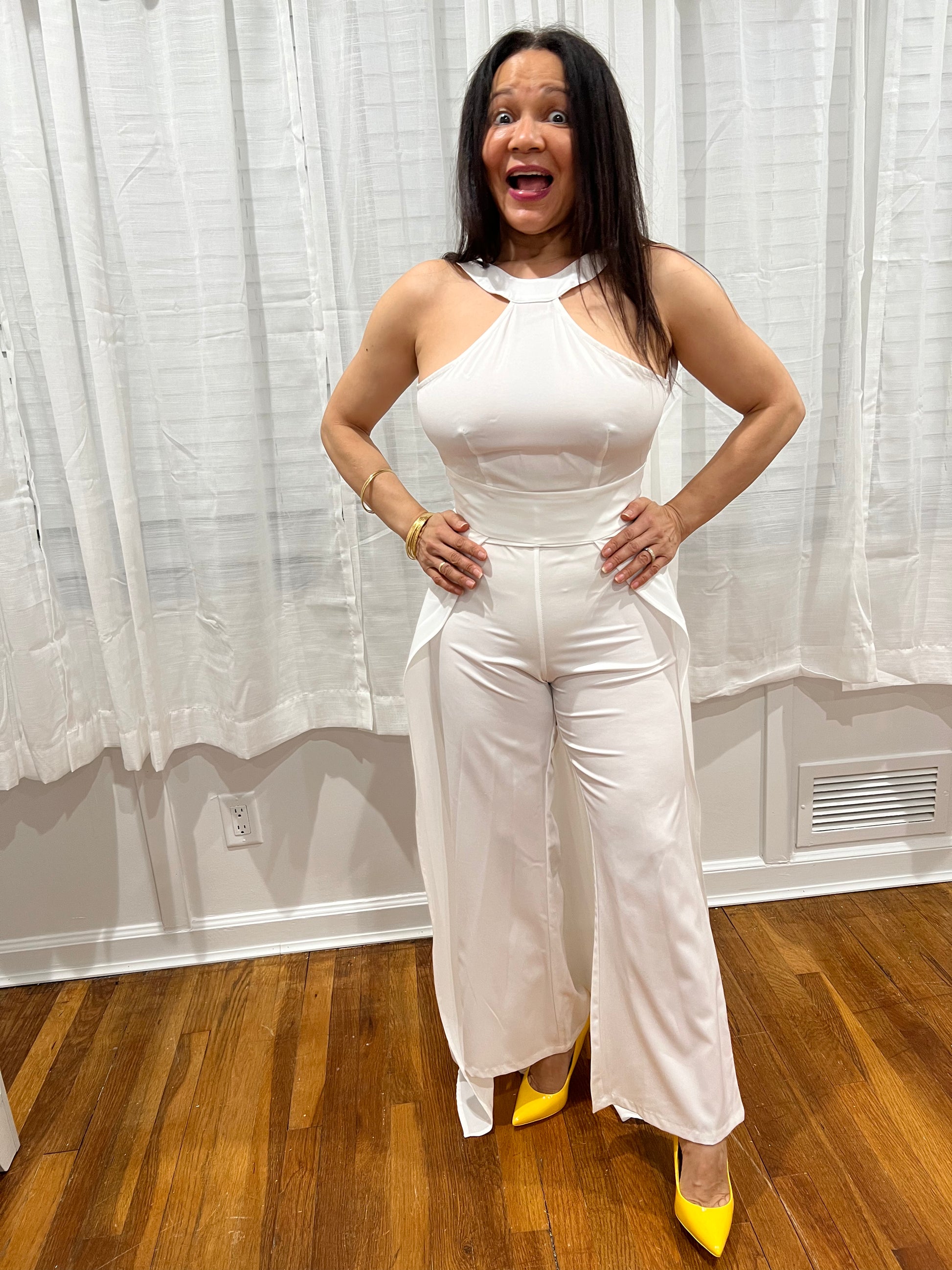 BLACK ELEGANT JUMPSUIT, NO SLEEVES, LONG PANTS WITH ATTACHED SKIRT UNIQUE STYLE ON THE BACK. ALL YEAR AROUND