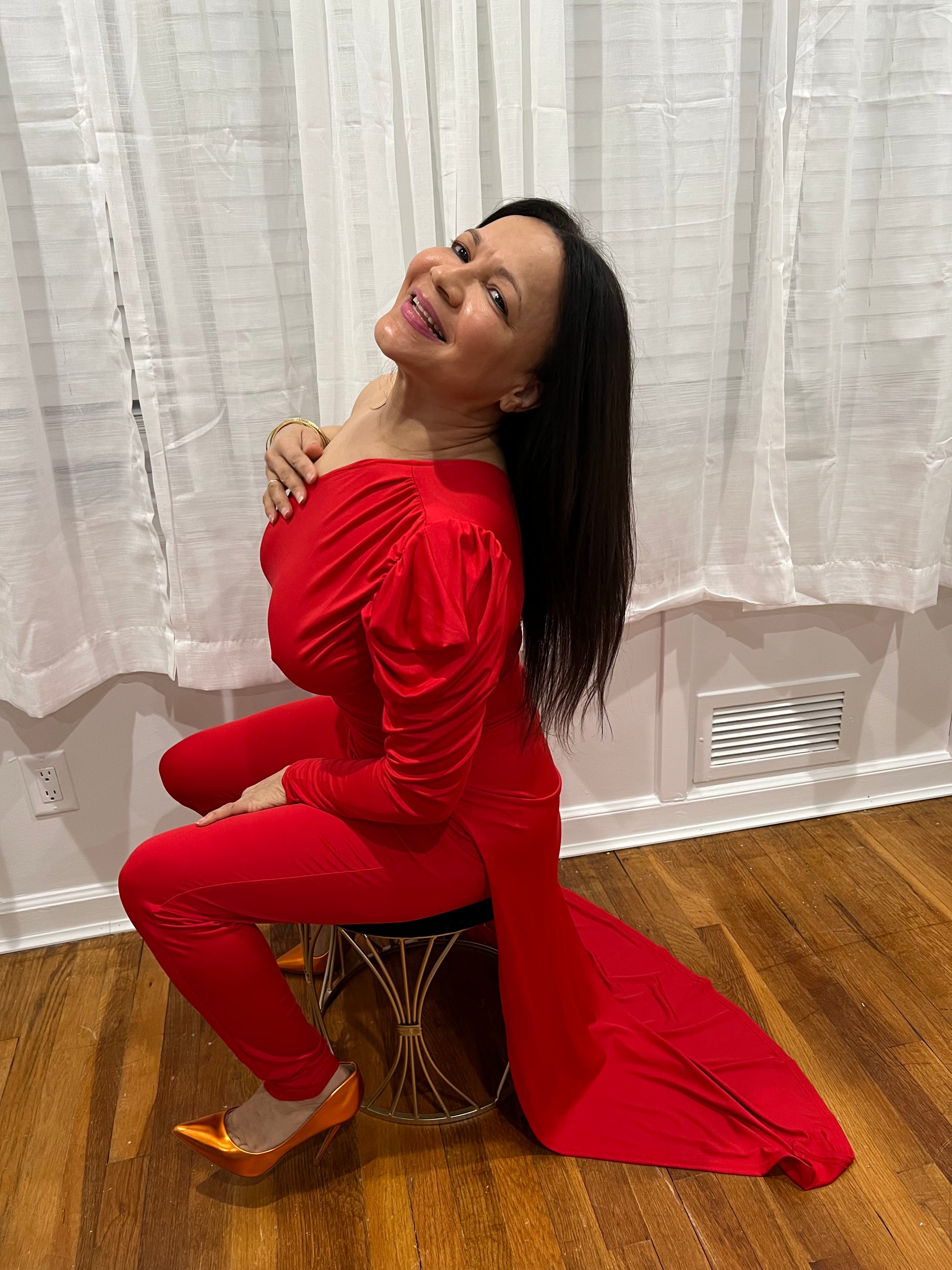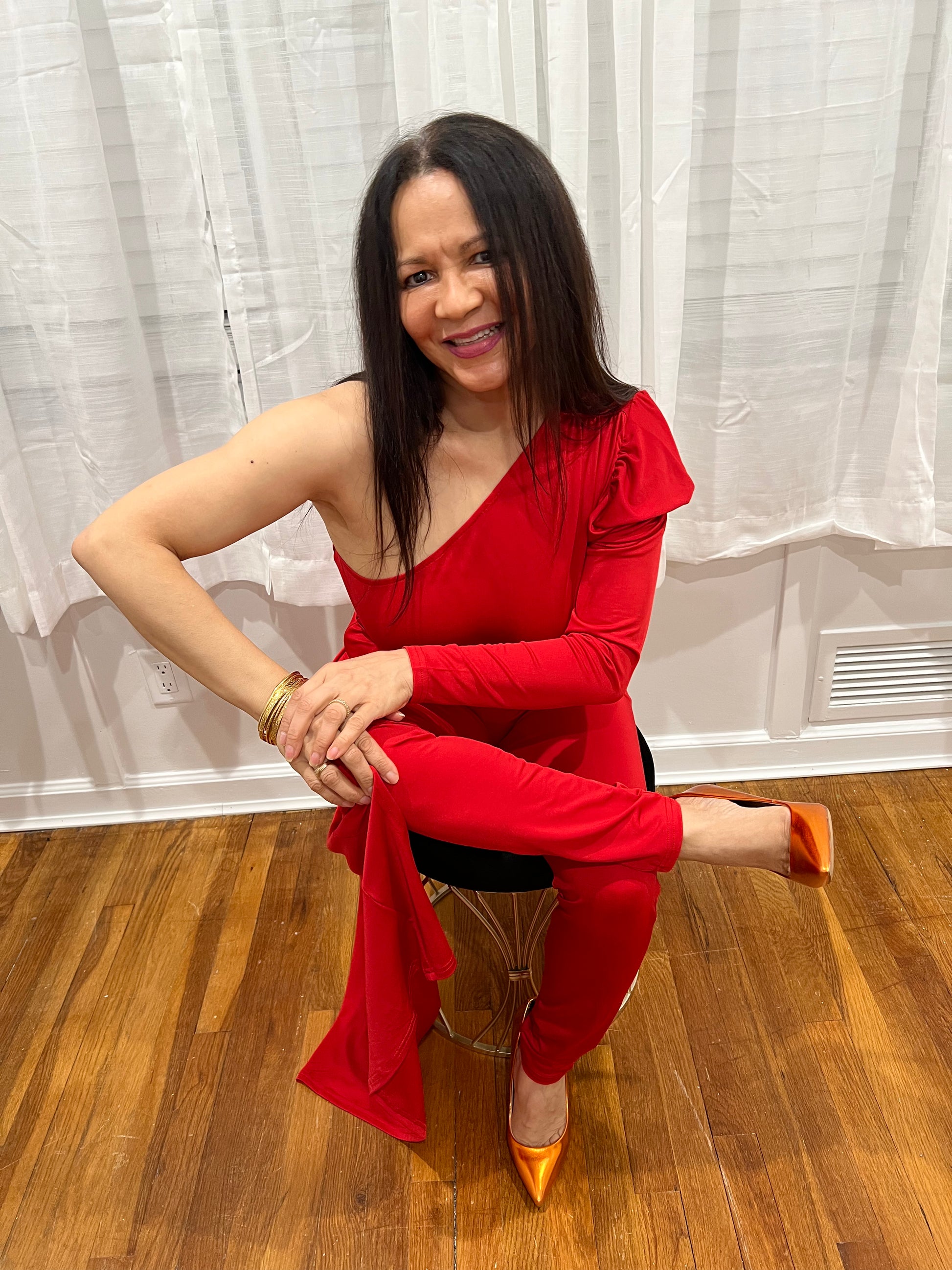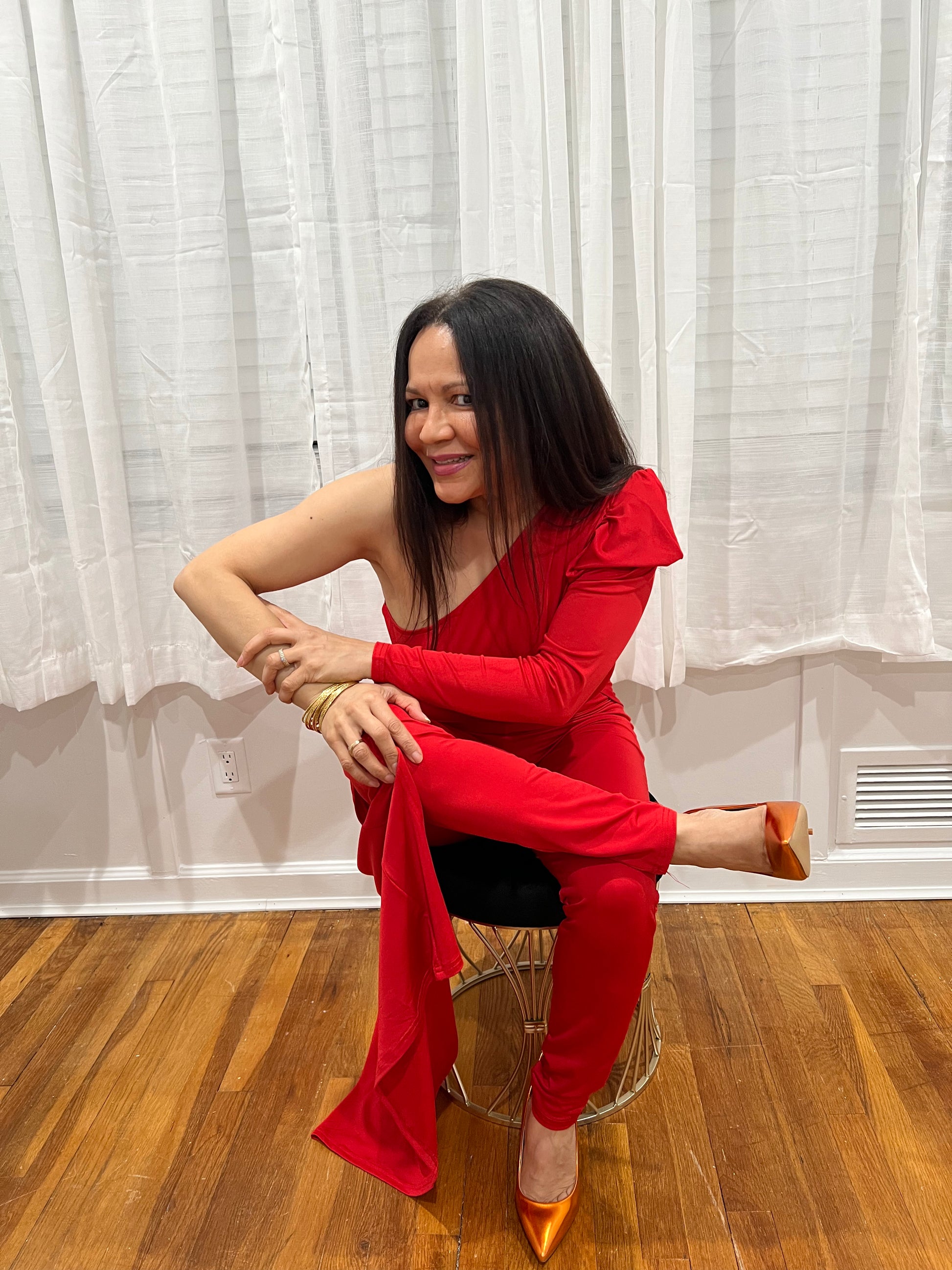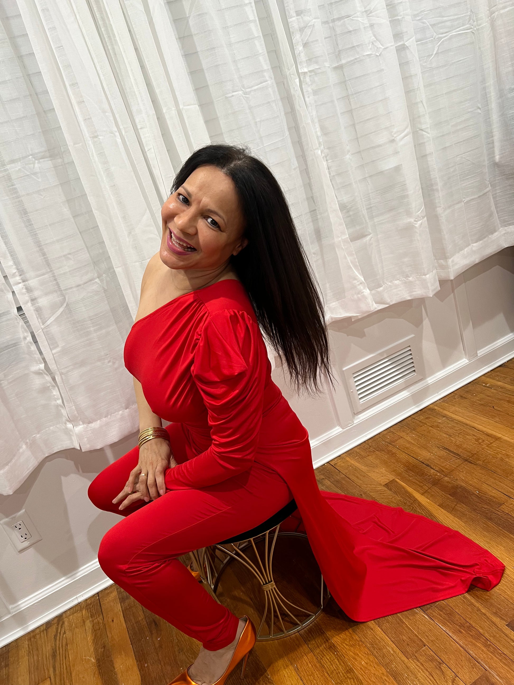 RED JUMPSUIT FOR ALL YEAR AROUND ONE SHOULDER, ONE LONG SLEEVE ONE SHOULDER OUT, SOPHISTICATE, BEAUTIFUL AND SEXY PIECE COLLECTION. GREAT FOR TRAVELING VERY LIGHT.