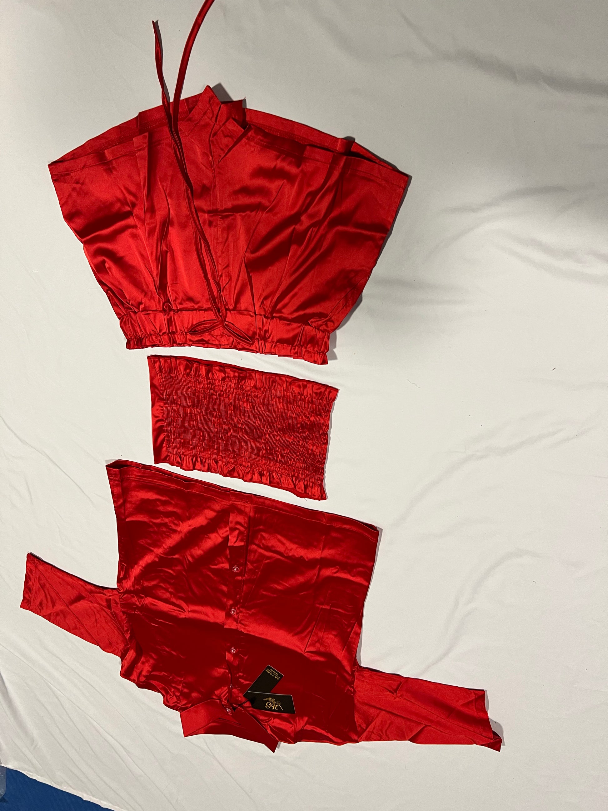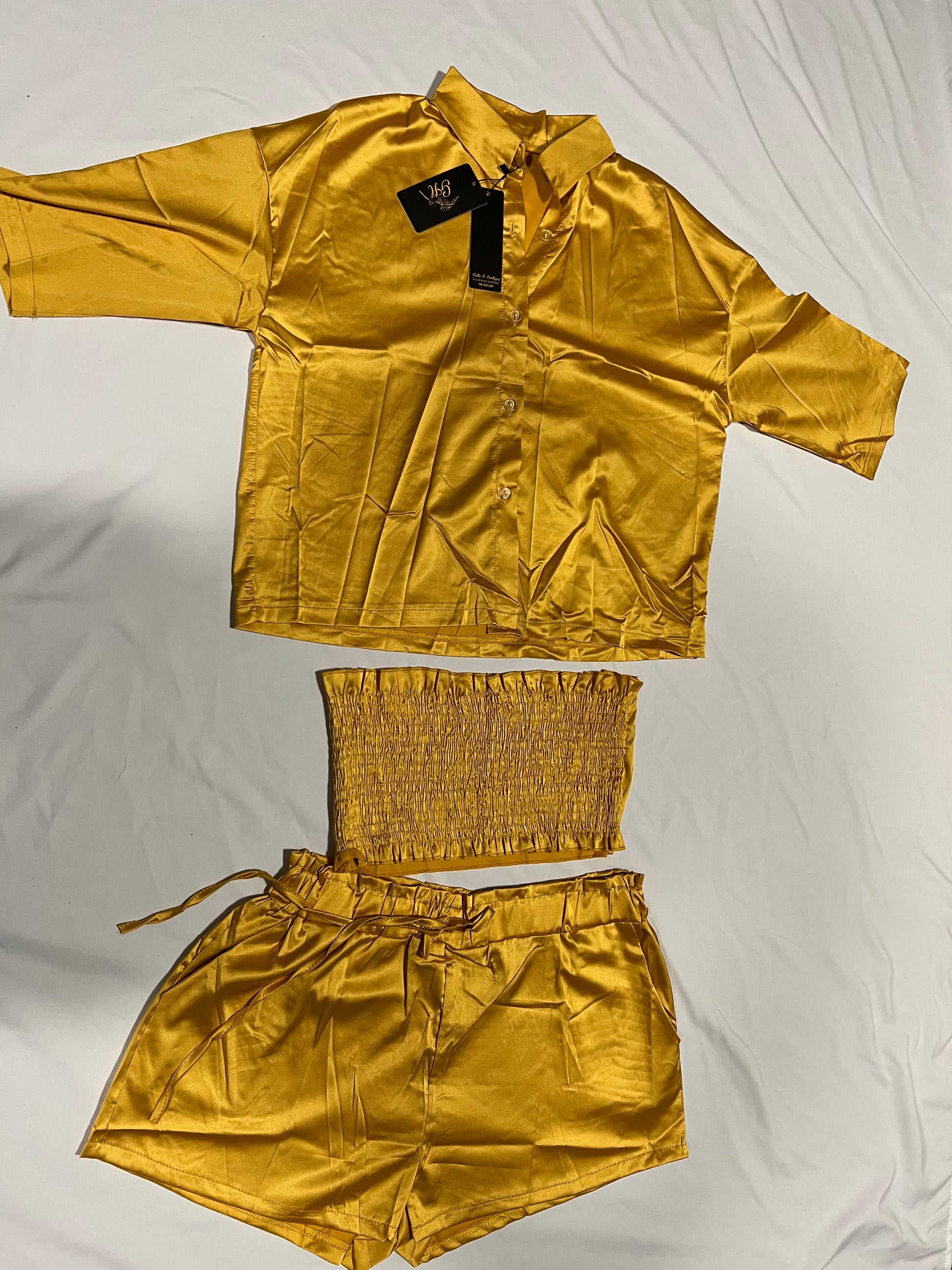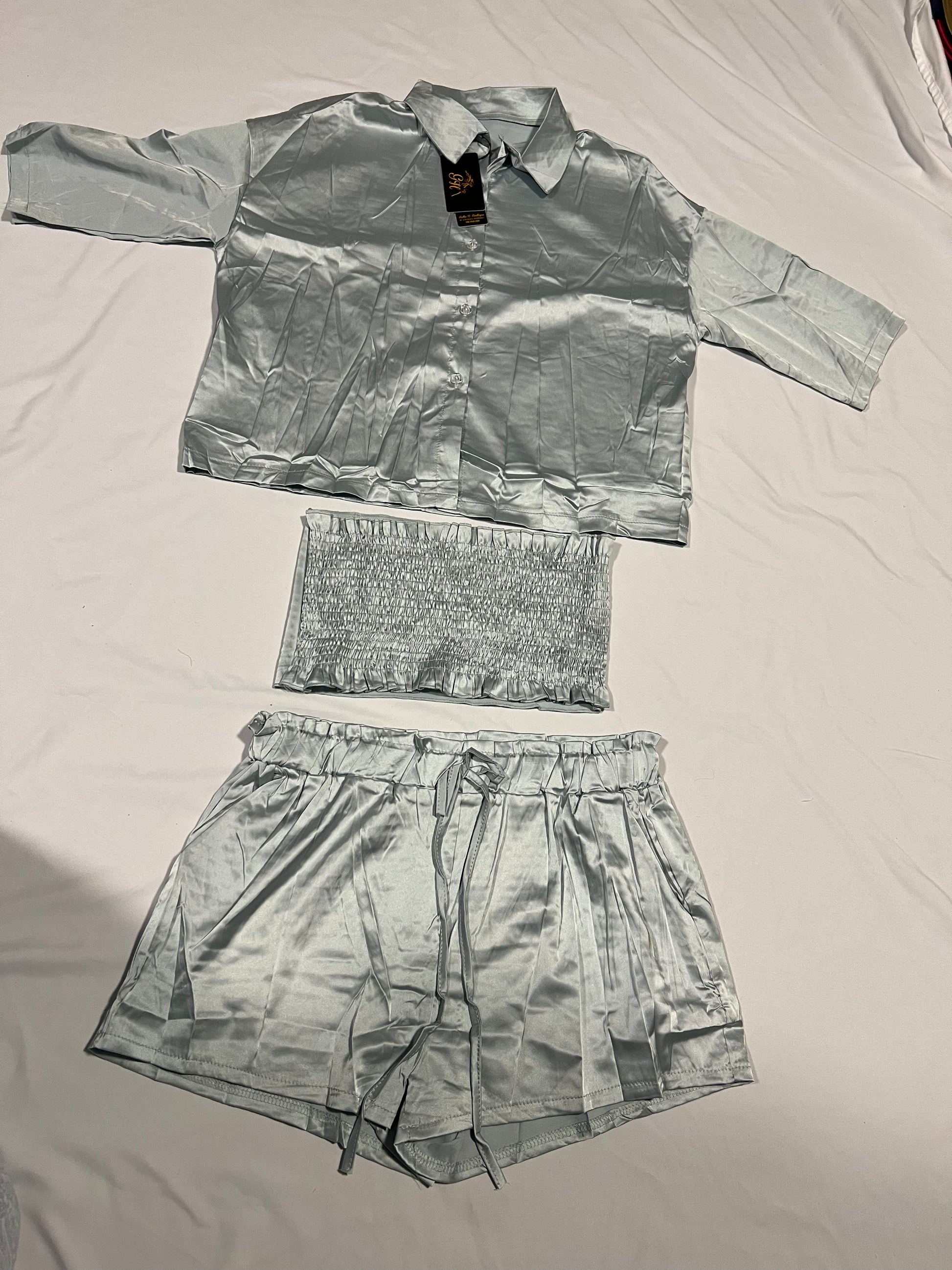 SHORT SATIN 3 PIECE SHORT SET. BEAUTIFUL AND SOPHISTICATED.LIGH, VIBRANT COLORS, EXCELLENT FOR VACATIONS AND ANY OCCASION. AN AMAZING LOOK!