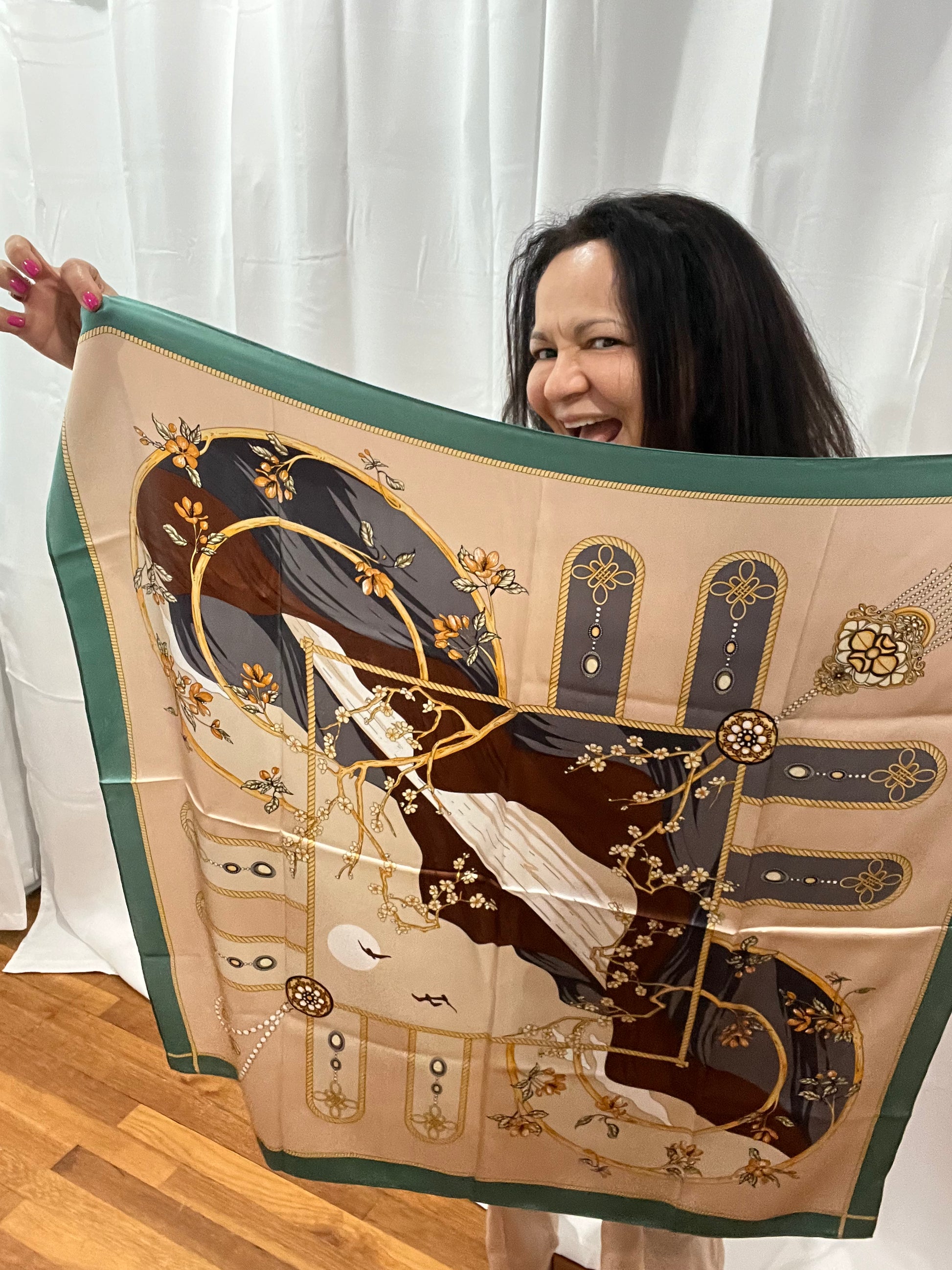 TURQUOSE GOLD MEDICI BORDER SILK SCARVES FOR ALL YEAR AROUND AND ALL OCCASIONS. ADD THIS AMAZING DESIGNER GLAMOUR ACCESSORY TO ANY OUTFIT, YOU WILL BE PLEASED. A MUST FOR TRAVELING. 90 CM By 90 CM, Scarf @2